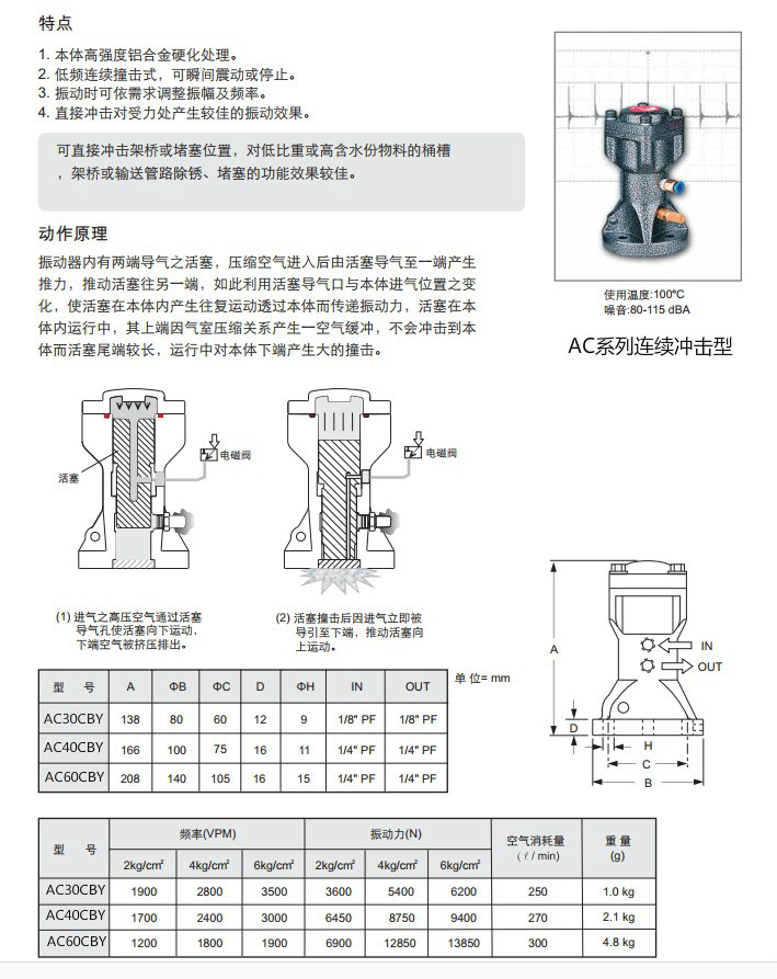 產(chǎn)品名稱:連續(xù)沖擊氣動(dòng)振動(dòng)器AC30CBY AC40CBY AC60CBY(飛馳)